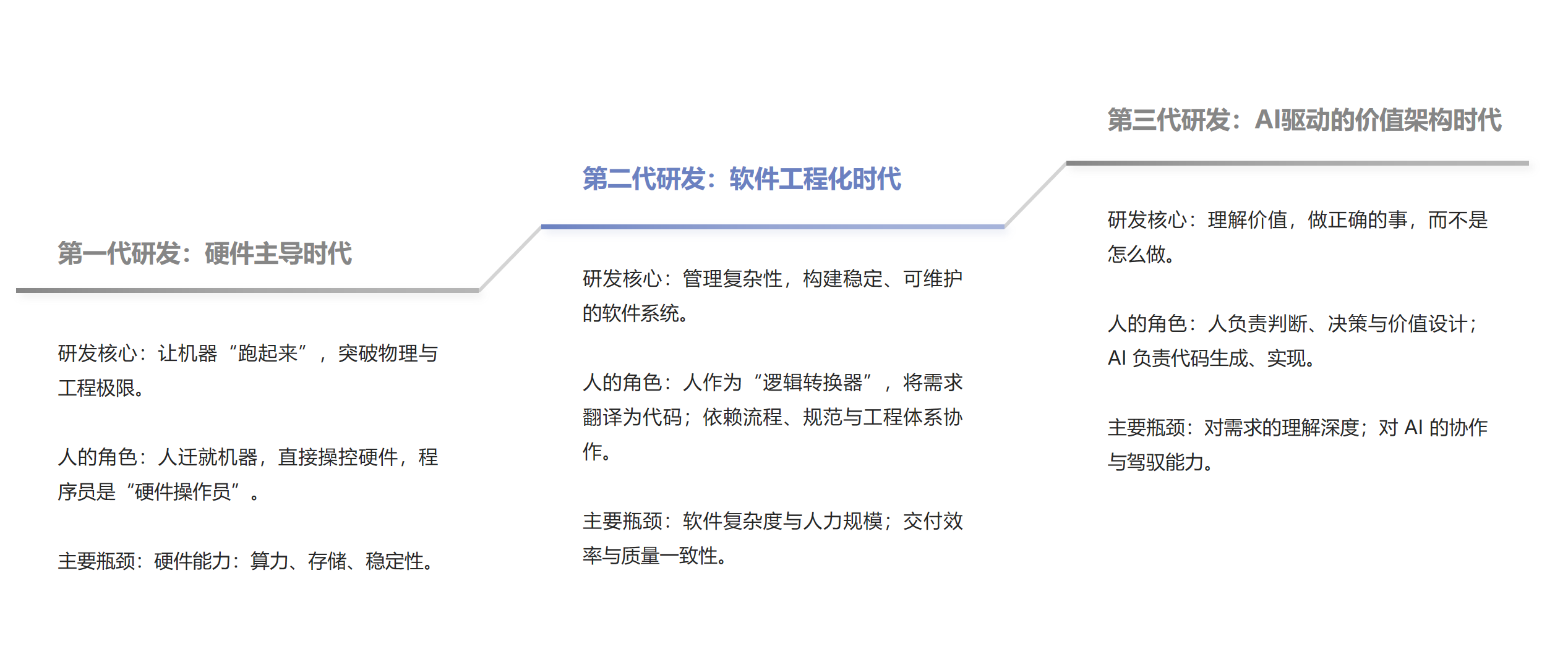 但现在,我们正处于第三代研发的黎明。在 AI 时代,代码的生成、重构、排错正在被大模型以惊人的速度“商品化”。过去需要五年经验才能掌握的框架细节,现在 AI 几秒钟就能搞定。“怎么实现”不再是最大的难题,“做什么”以及“为什么做”才是核心。