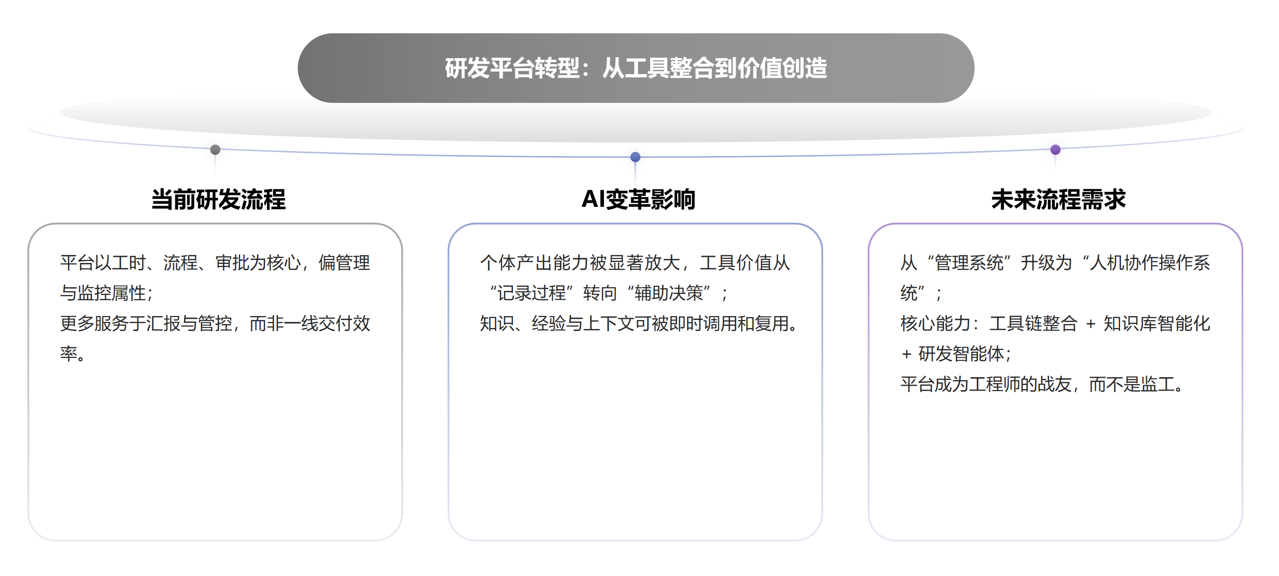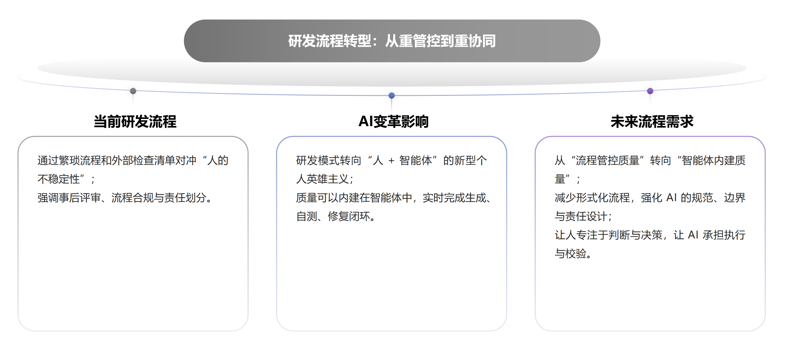 为了不被时代“干掉”,我们要主动出击。未来的工作重心将不再是修补旧船,而是建造新时代的航母。因此,作为研发型的企业,我们需要围绕以下四个关键维度展开深度变革: