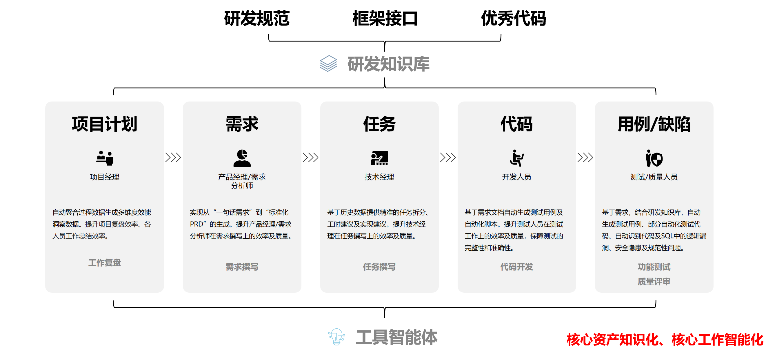 我们不再单纯考核人工作时长及代码产出,而是要彻底改变对研发角色的定义。要为每一个关键角色配备专属的“AI 副驾驶”,打通从需求到交付的智能链路: