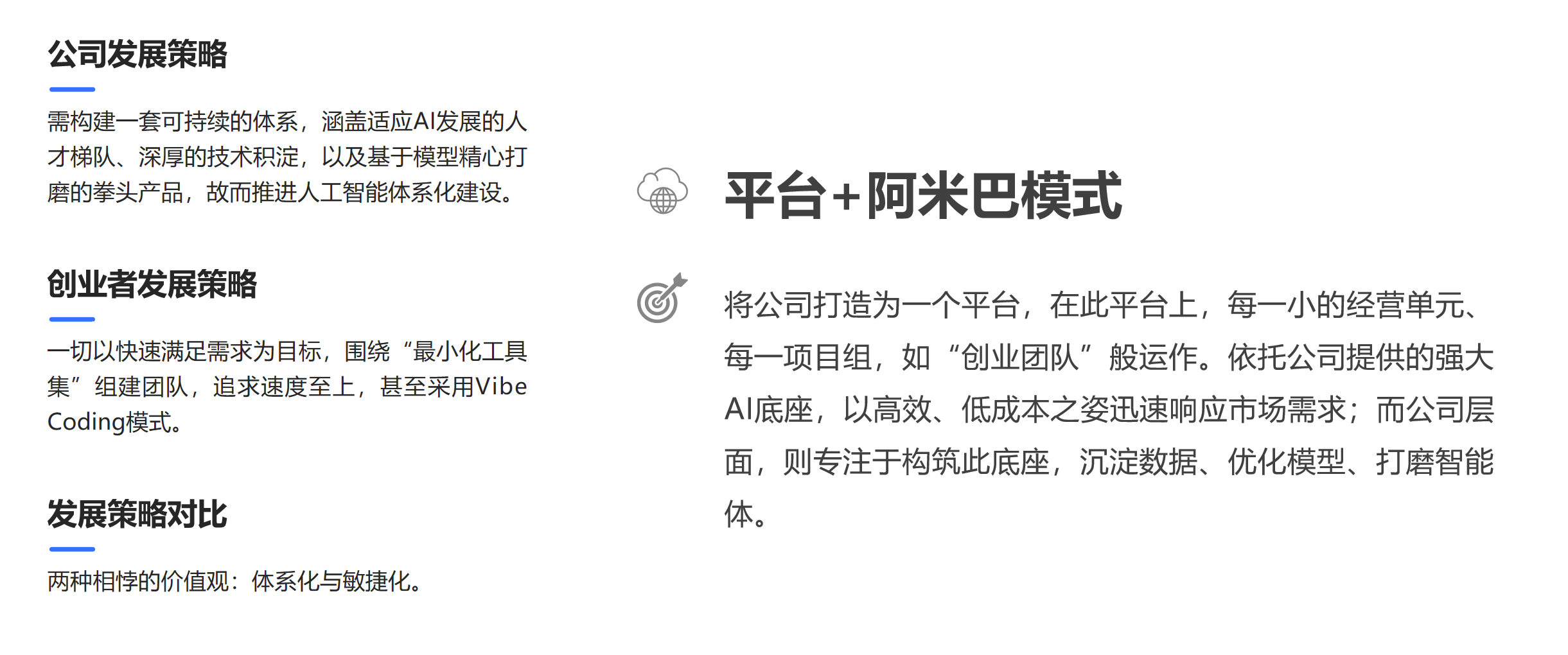 我们要把公司打造成一个平台,在这个平台上,每一个小的经营单元、每一个项目组,都应该像一个“创业团队”。他们利用公司提供的强大 AI 底座,以极高的效率、极低的成本快速响应市场需求;而公司层面,则专注于构建这个底座,沉淀数据、优化模型、打磨智能体。